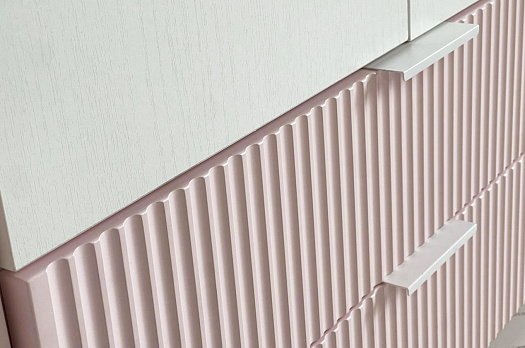 - На фасадах выкатных ящиков присутствуют вертикальные полосы, создающие особый акцент, они выполнены с использованием фрезеровки.