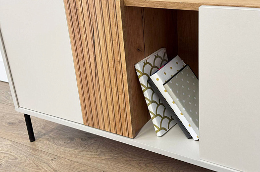 Тумба "Доминика" - это идеальное сочетание функциональности и элегантного дизайна, способное украсить любой интерьер. Она может служить как комодом для хранения различных предметов, так и тумбой для телевизора, обеспечивая удобство и стиль.