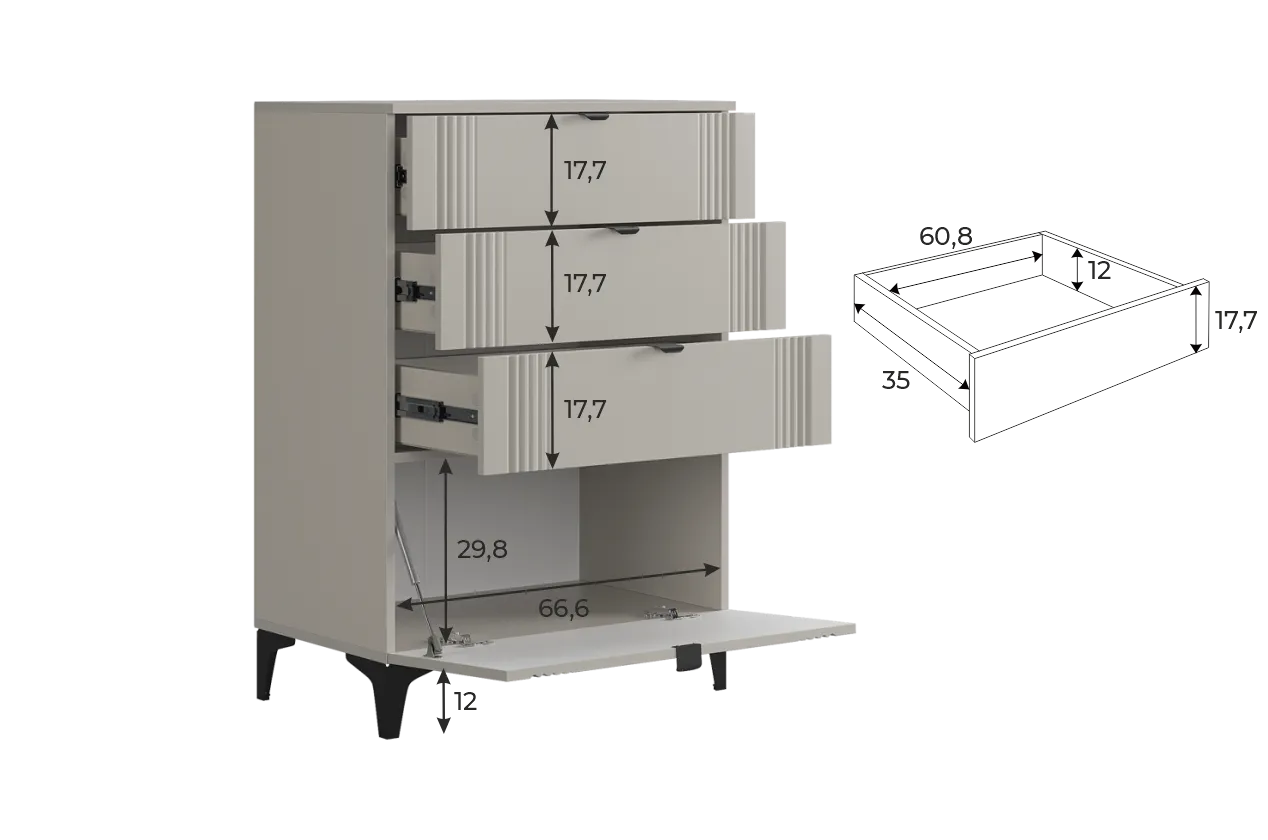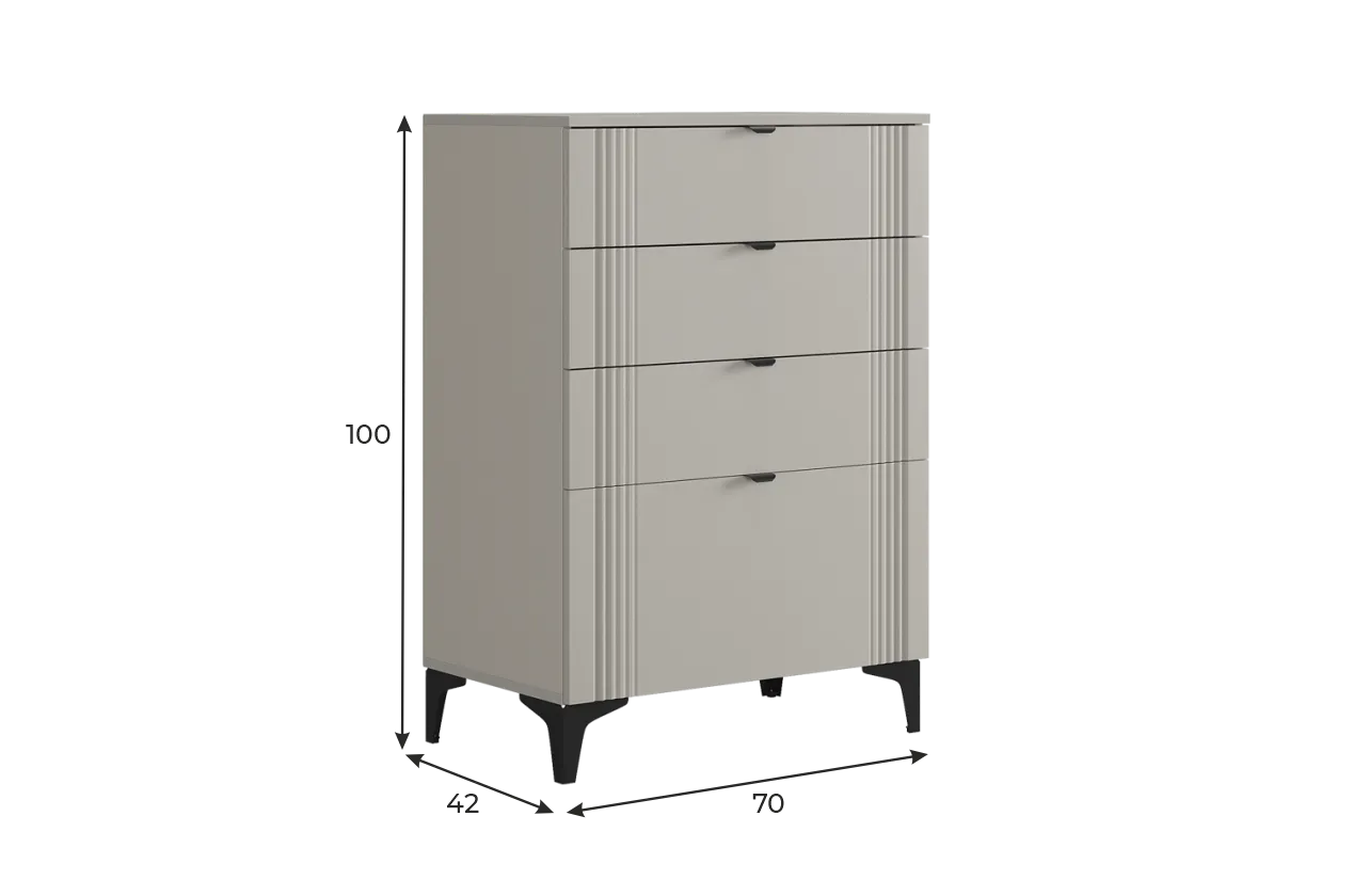 Комод изготовлен из качественных материалов: корпус выполнен из ЛДСП, что гарантирует прочность и долговечность, а фасад, выполненный из МДФ в плёнке ПВХ, не только выглядит эстетично, но и защищает комод от повреждений. Особое внимание заслуживает фрезеровка фасадов, которая придаёт изделию изысканный вид.