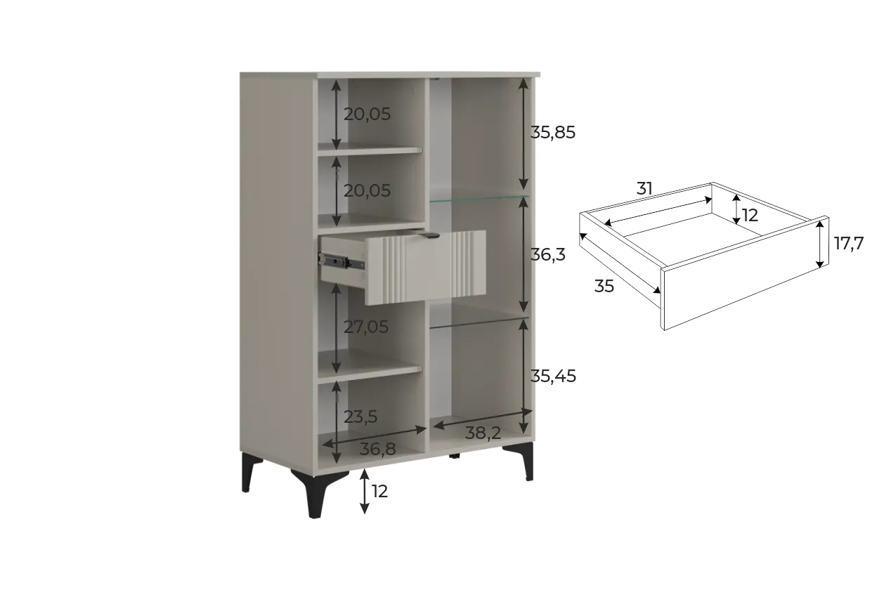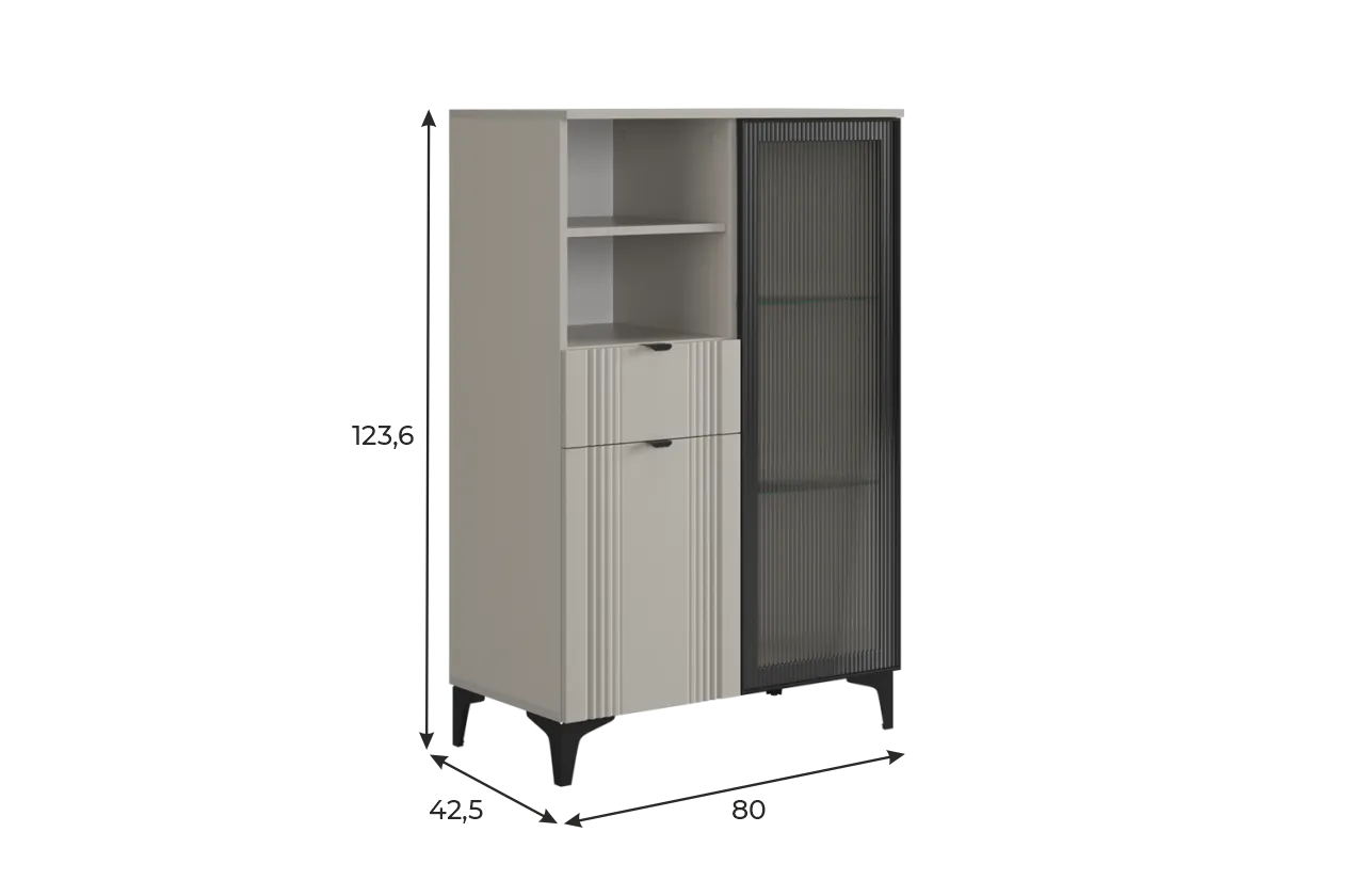 Дизайн комода продуман до мелочей: с одной стороны расположена стеклянная дверца, за которой находится просторное пространство для хранения. С другой стороны – ниша с открытой полкой, выкатной ящик и ещё одна глухая дверца, что позволяет гибко организовать хранение и поддерживать порядок в доме.