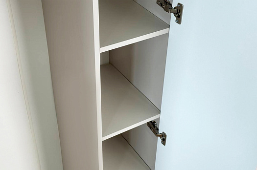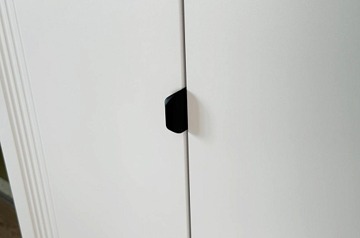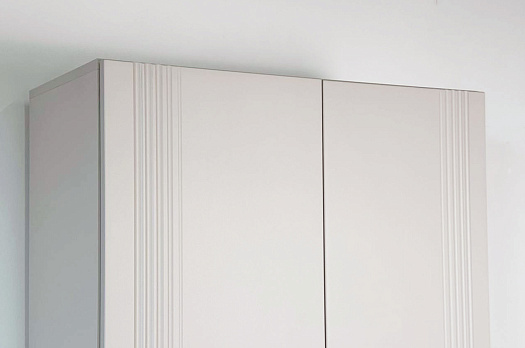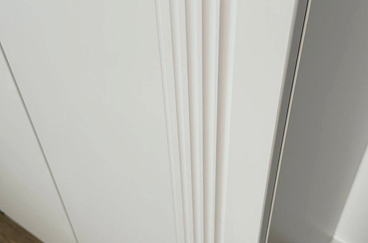 Корпус шкафа изготовлен из ЛДСП, что гарантирует прочность и долговечность. Фасад, покрытый МДФ в плёнке ПВХ, не только выглядит эстетично, но и защищает шкаф от повреждений. Особое внимание заслуживает фрезеровка фасадов, которая придаёт шкафу изысканный вид.