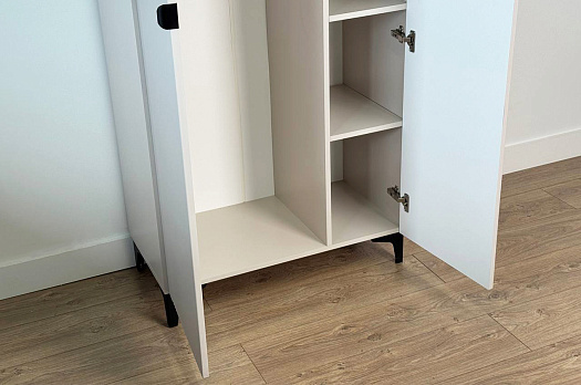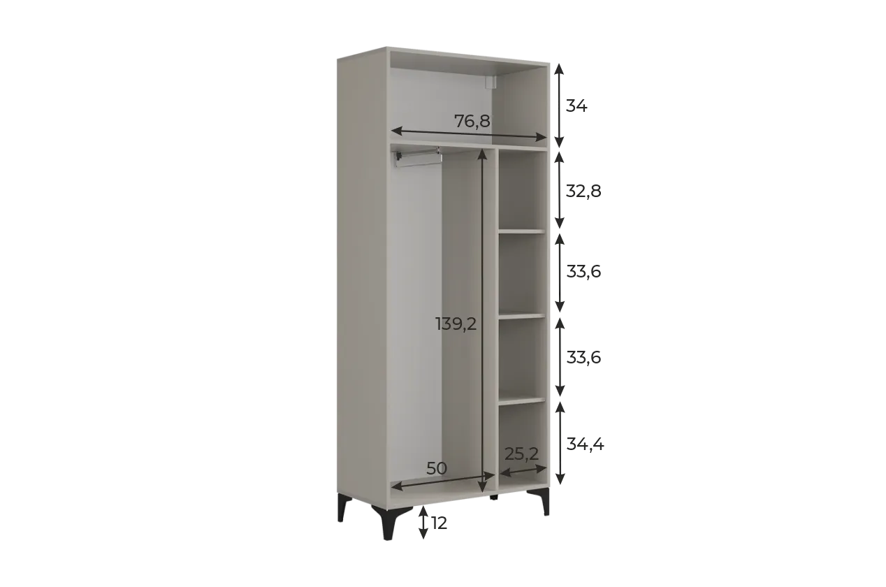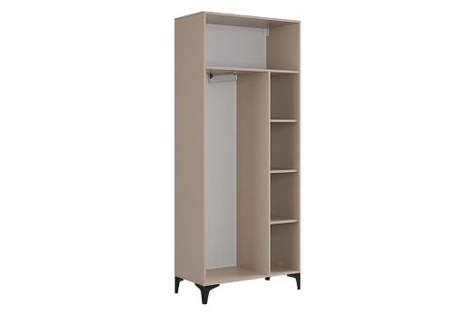Шкаф оснащён надёжными металлическими ручками и имеет удобное внутреннее наполнение: справа расположены полки, а слева — штанга для вешалок. Это позволяет рационально использовать пространство и разместить различные типы одежды.