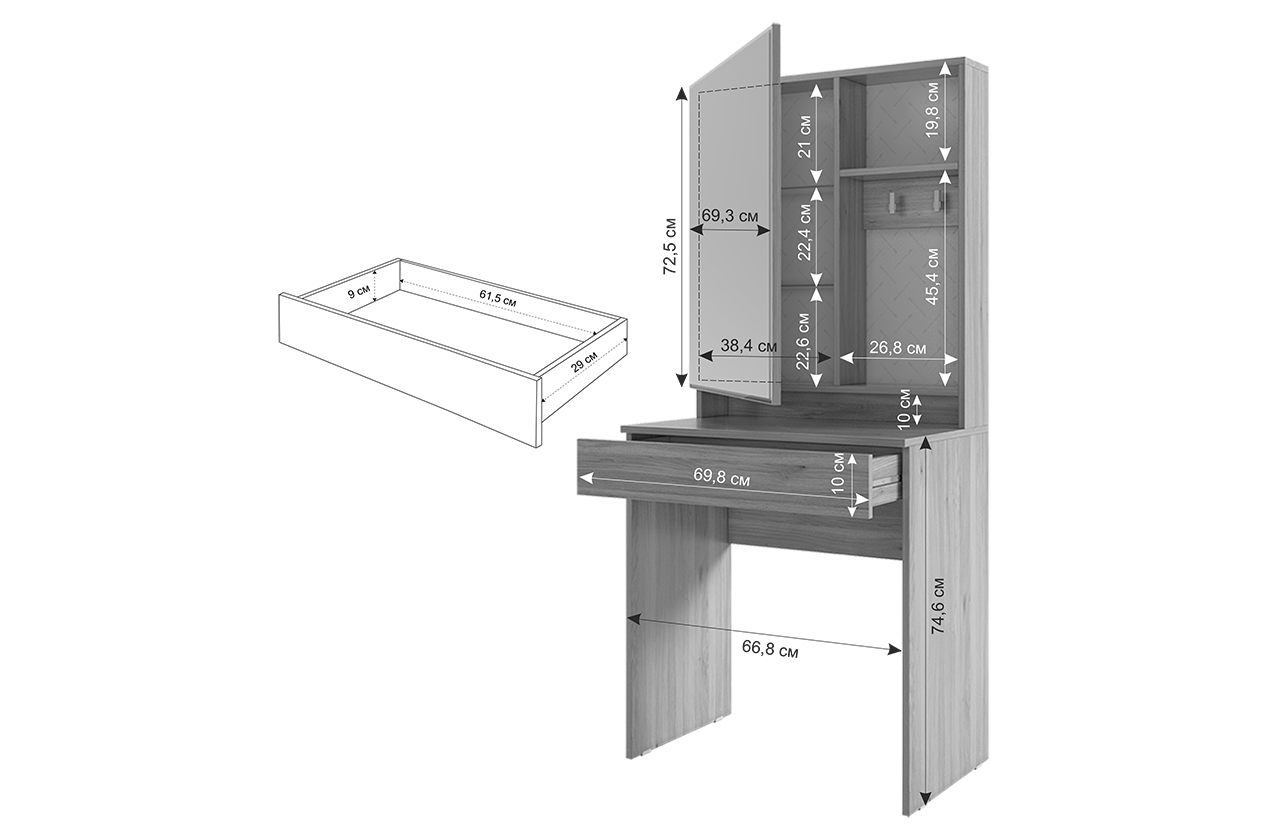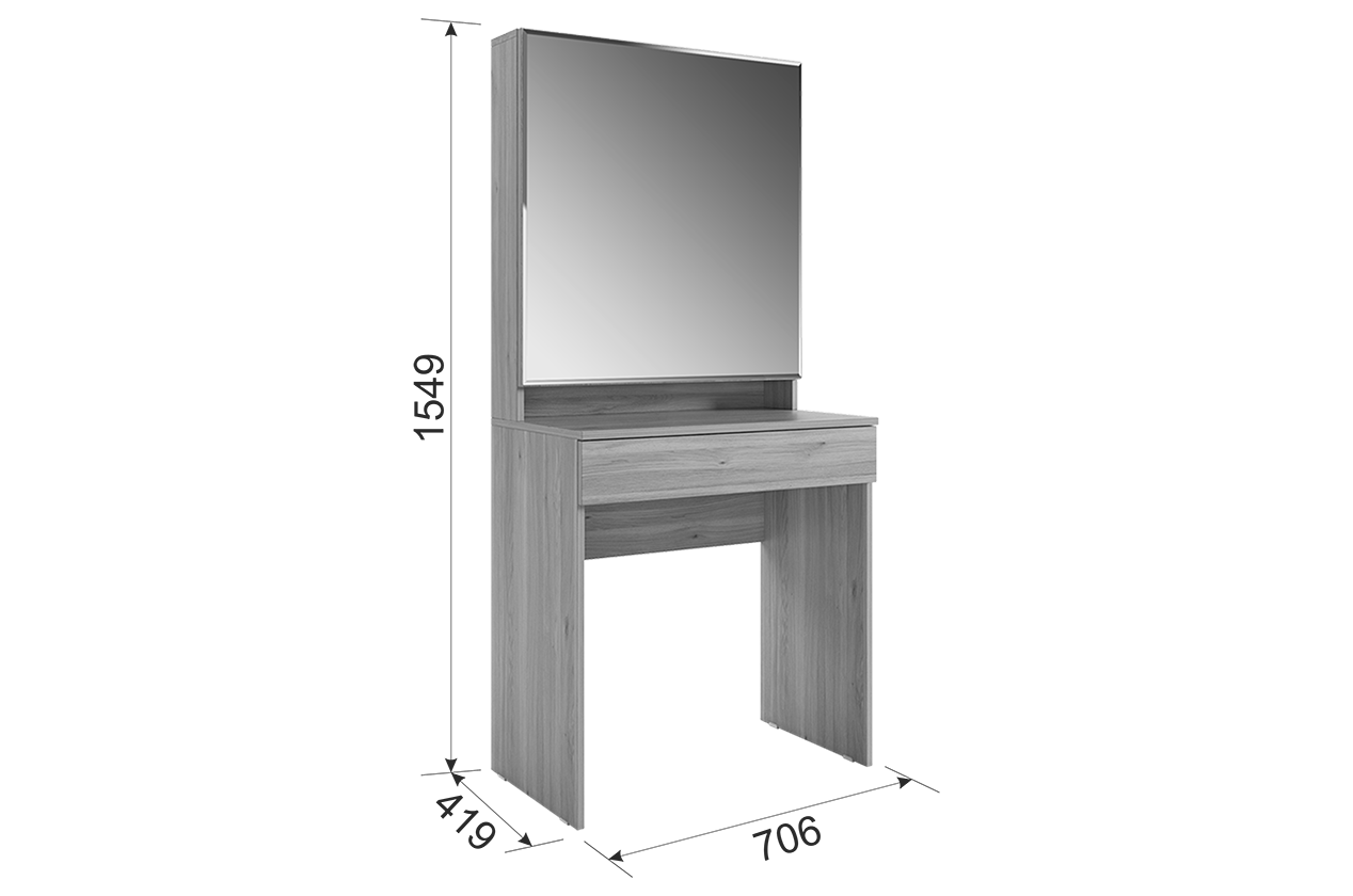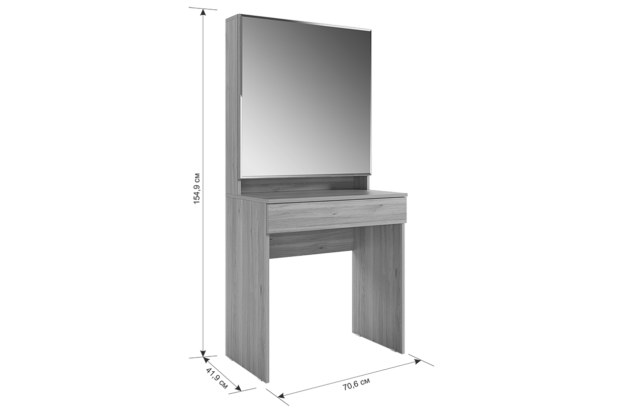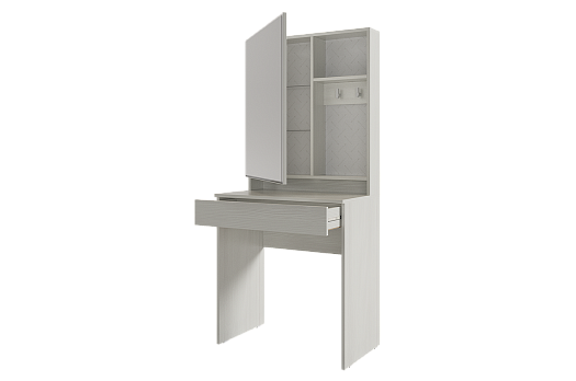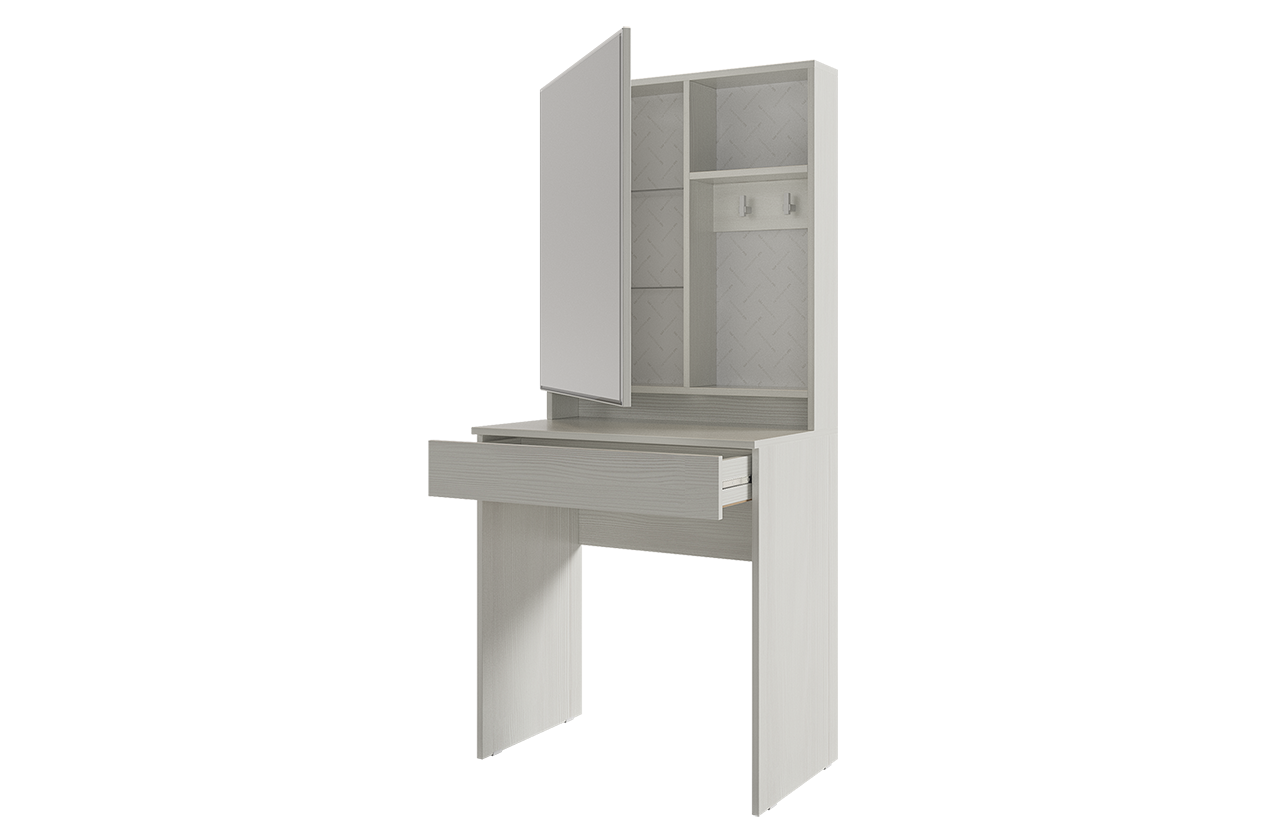 Трюмо Аурика станет незаменимым атрибутом вашей спальни или гардеробной. Эта модель идеально сочетает в себе практичность и стиль. За его зеркалом расположены стеклянные полки, которые станут идеальным местом для хранения всех ваших косметических средств и аксессуаров. Крючки предлагают дополнительное пространство для украшений или фена. Фацет на кромке зеркала добавляет изящество, преломляя свет и визуально расширяя пространство комнаты.