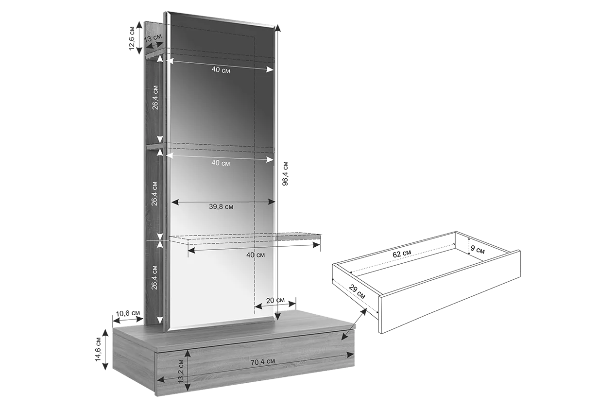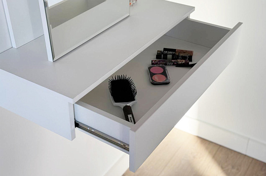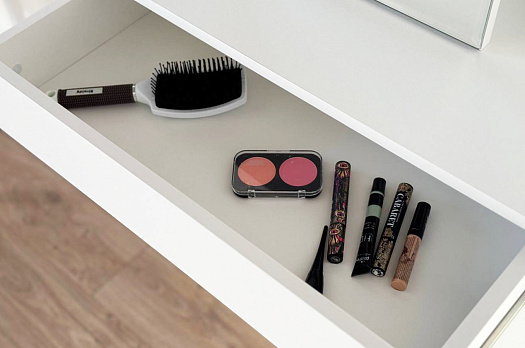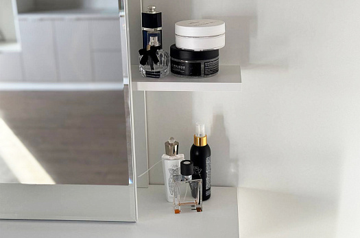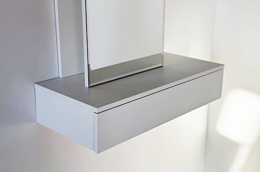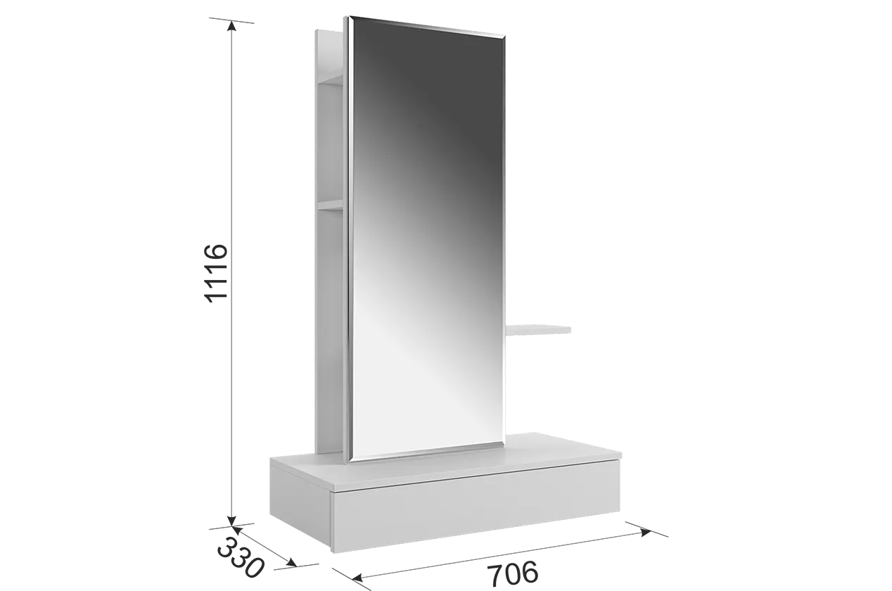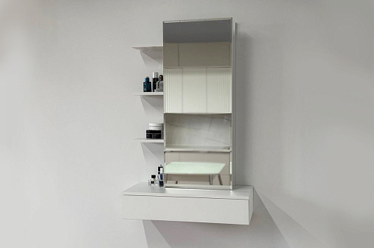 Трюмо Мария создано для тех, кто ценит универсальность и комфорт в интерьере. Эта модель легко приспосабливается к вашим предпочтениям: повесите трюмо на любой высоте и выберите удобное расположение зеркальной панели — справа или слева. Небольшие полки предлагают пространство для вашей косметики и парфюмерии, а выкатной ящик позволит держать необходимые мелочи под рукой. Крючок предусмотрен для украшений или бытовой техники, такой как фен.