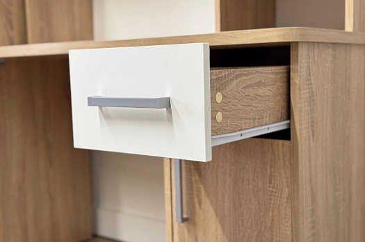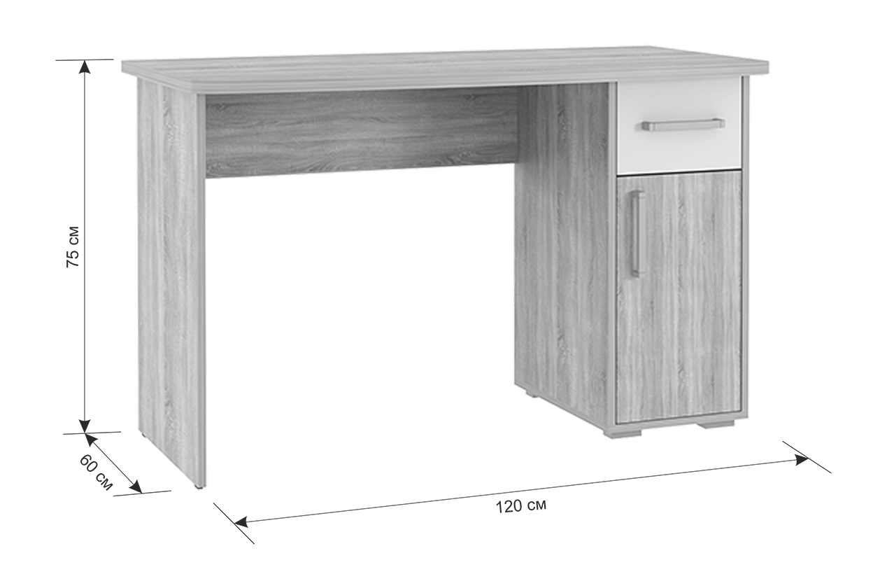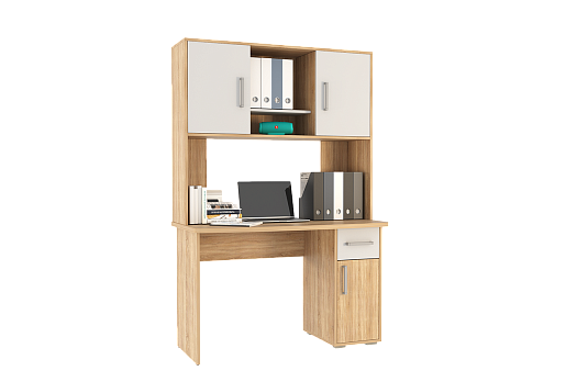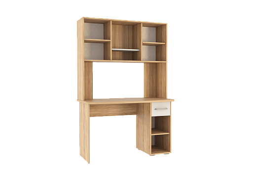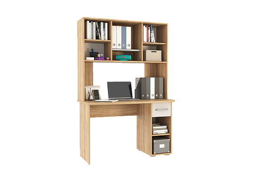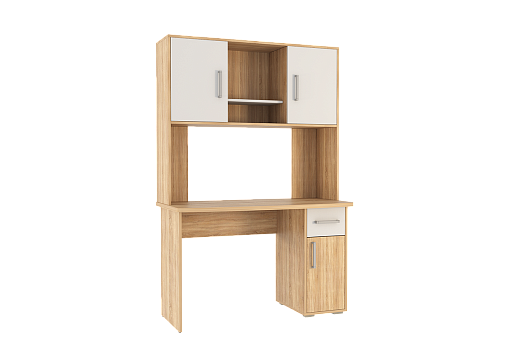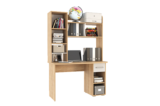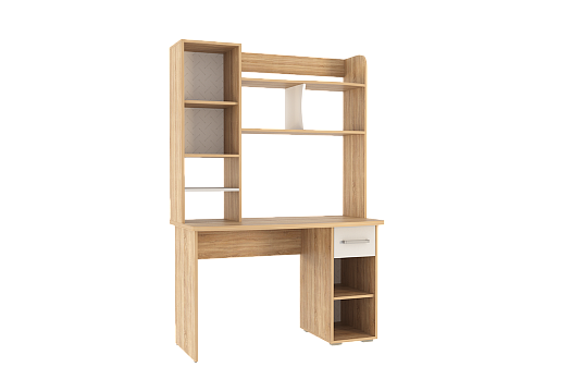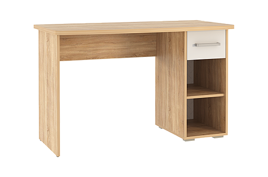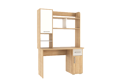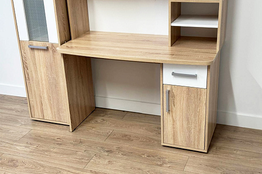 Стол выполнен из качественного материала ЛДСП в цвете дуб сонома с белыми элементами. Особенностью дизайна являются радиусные элементы и утолщенная столешница толщиной 25 мм. Для расширения функциональности стола рекомендуется дополнить его надстройкой и стеллажом из той же серии Лайт-1.