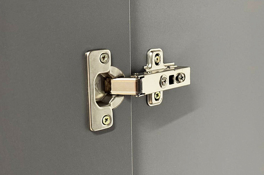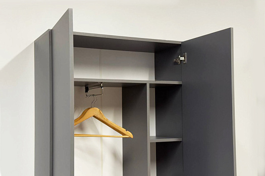 Шкаф оснащен накладными петлями с доводчиком от Боярд, которые обеспечивают плавное и бесшумное закрывание дверей. Выдвижная штанга и отделение с полками предоставляют удобный доступ к одежде, позволяя легко организовать внутреннее пространство.