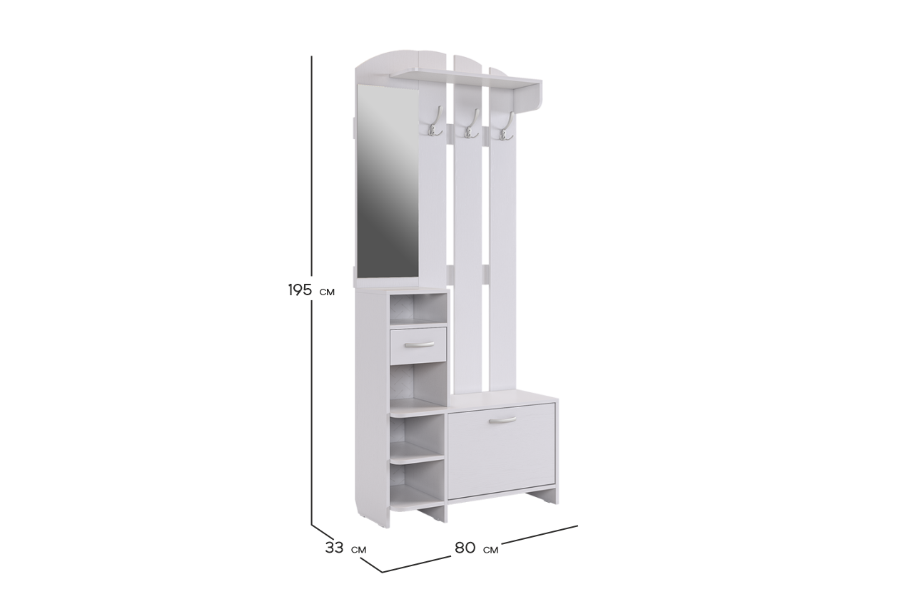 Прихожая Мила: эффективное решение для оптимального использования пространства, сочетающее в себе открытую вешалку с крючками, место для обуви, компактное зеркало и удобный ящик с полочками для всевозможных мелочей.