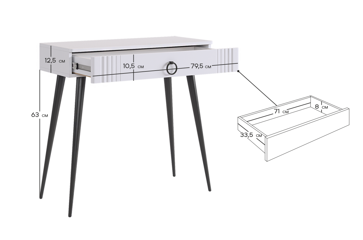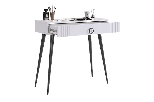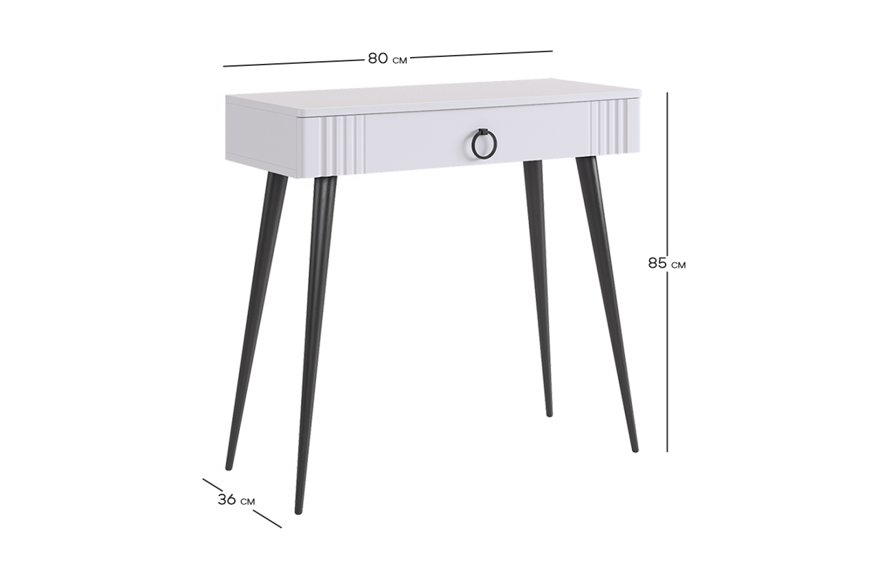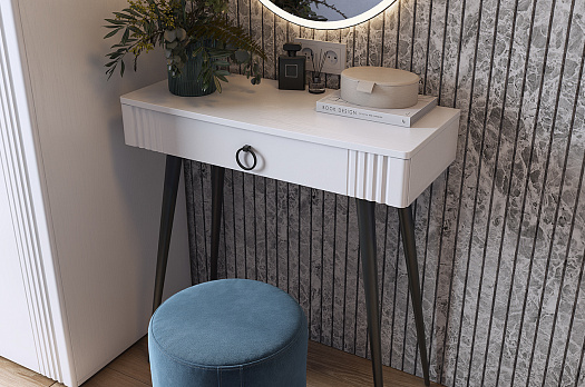 Туалетный столик 2 "Ева" – это элегантное и функциональное решение для вашей спальни. Шариковые направляющие на ящике обеспечивают плавное открывание и закрывание. Устойчивые черные опоры добавляют стиля столику.