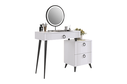 Туалетный столик  "Ева" прекрасно впишется в интерьер спальни или ванной комнаты благодаря своему стильному дизайну и функциональности. Вместительные выкатные ящики обеспечат удобное хранение косметики, украшений и других мелочей. Шариковые направляющие гарантируют легкость открывания и закрывания ящиков, а металлические ручки добавляют стильный акцент. Высокие черные опоры придают столику устойчивость и элегантность. Цветовое сочетание белого корпуса из ЛДСП и фасада из МДФ облицованного пленкой ПВХ создает свежий и модный образ мебели. Необычная фрезеровка фасада добавляет изысканности и утонченности этому туалетному столику.