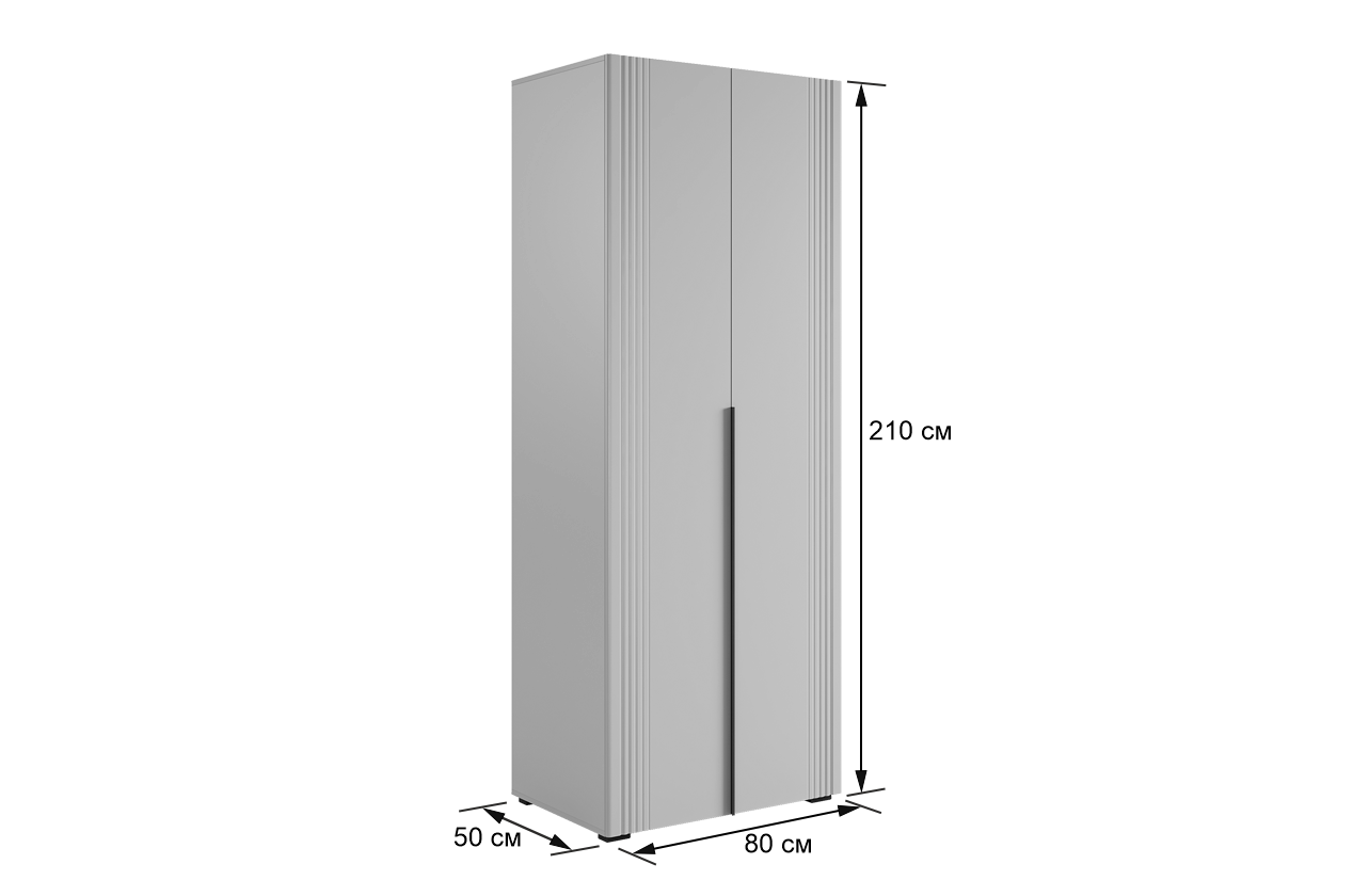 Шкаф оснащён длинными пластиковыми ручками и имеет удобное внутреннее наполнение: слева расположены полки, а справа — две штанги для вешалок. Это позволяет рационально использовать пространство и разместить различные типы одежды.