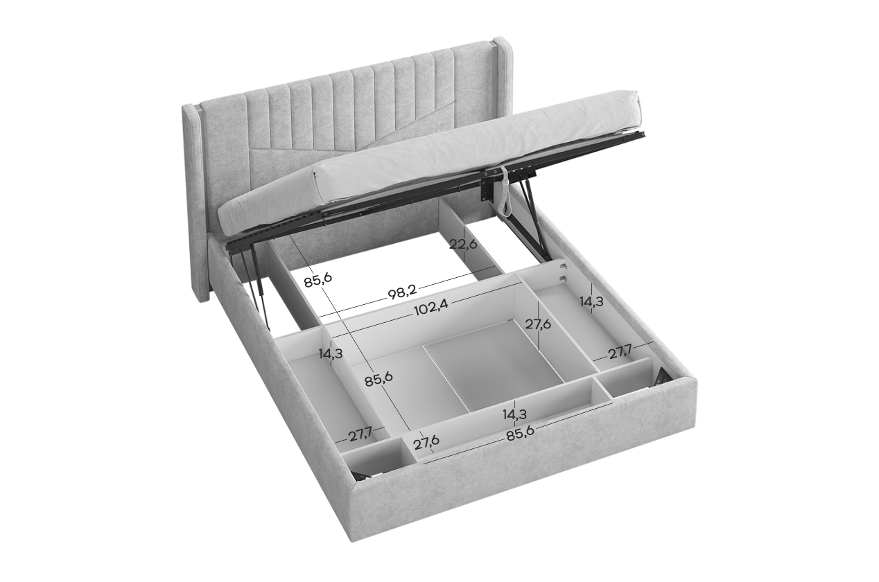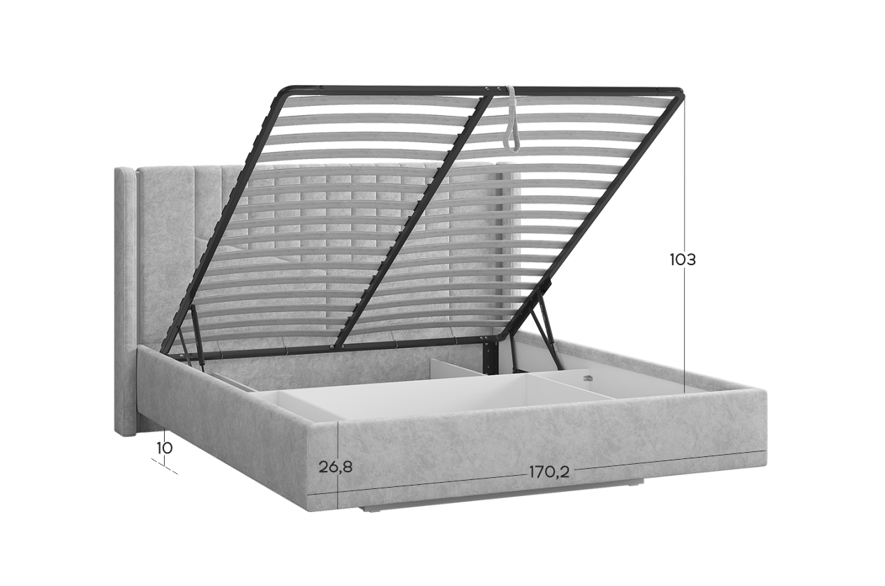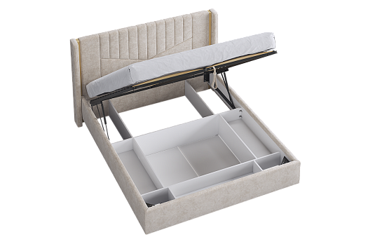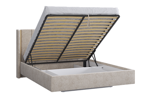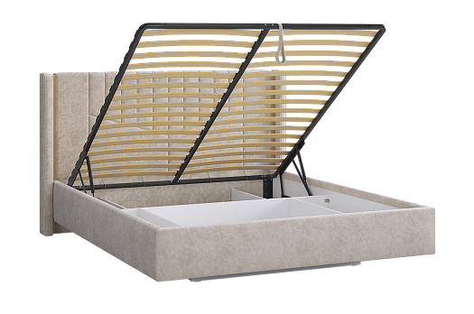 Подъёмное основание открывается легко и бесшумно благодаря газлифту, обеспечивая широкий угол подъёма и доступ к большому отделению для хранения вещей. Под кроватью размещён вместительный короб с прочными перегородками - идеальное место для постельного белья, одеял и сезонных вещей.