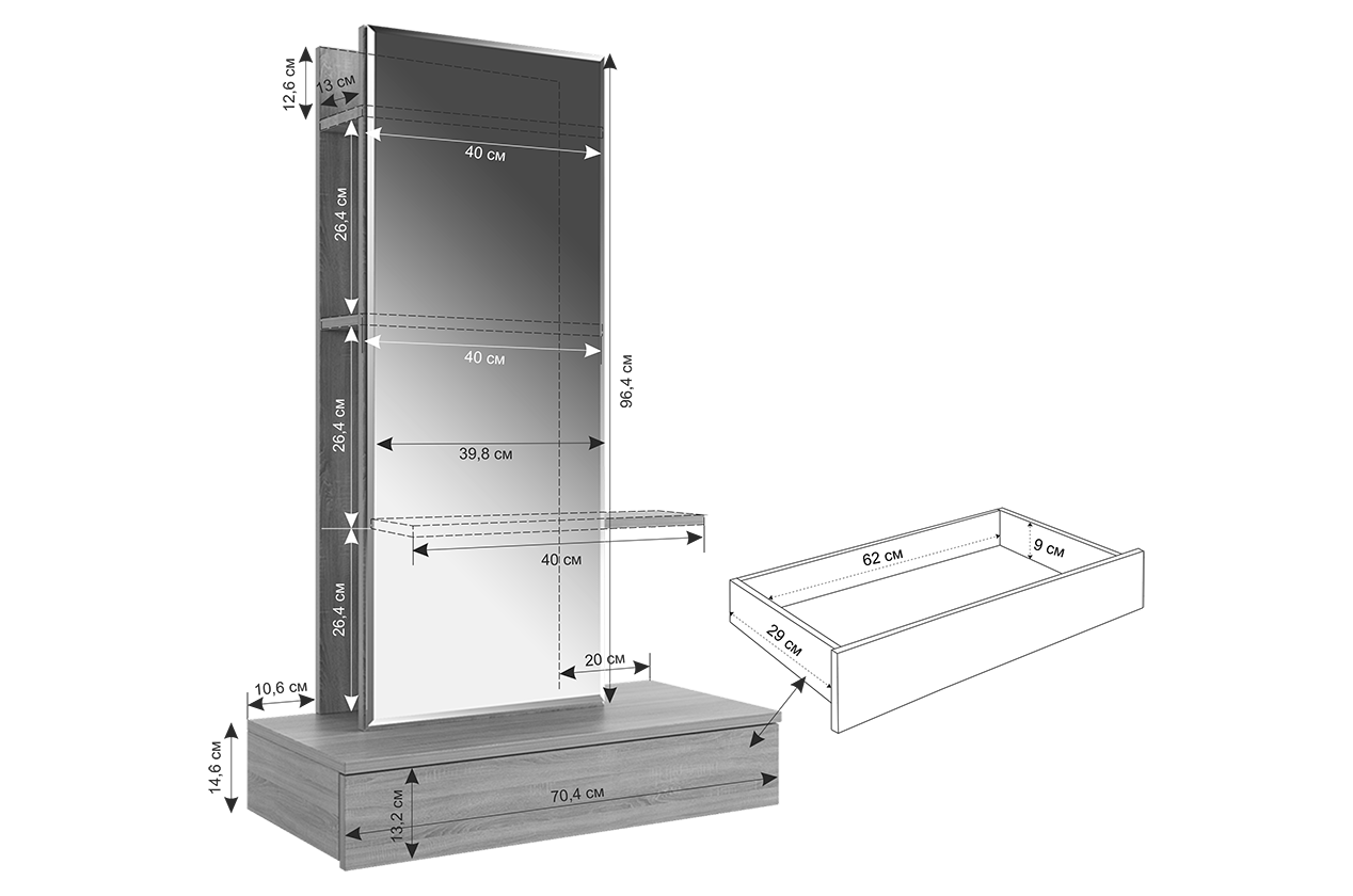 Трюмо Мария создано для тех, кто ценит универсальность и комфорт в интерьере. Эта модель легко приспосабливается к вашим предпочтениям: повесите трюмо на любой высоте и выберите удобное расположение зеркальной панели — справа или слева. Небольшие полки предлагают пространство для вашей косметики и парфюмерии, а выкатной ящик позволит держать необходимые мелочи под рукой. Крючок предусмотрен для украшений или бытовой техники, такой как фен.
