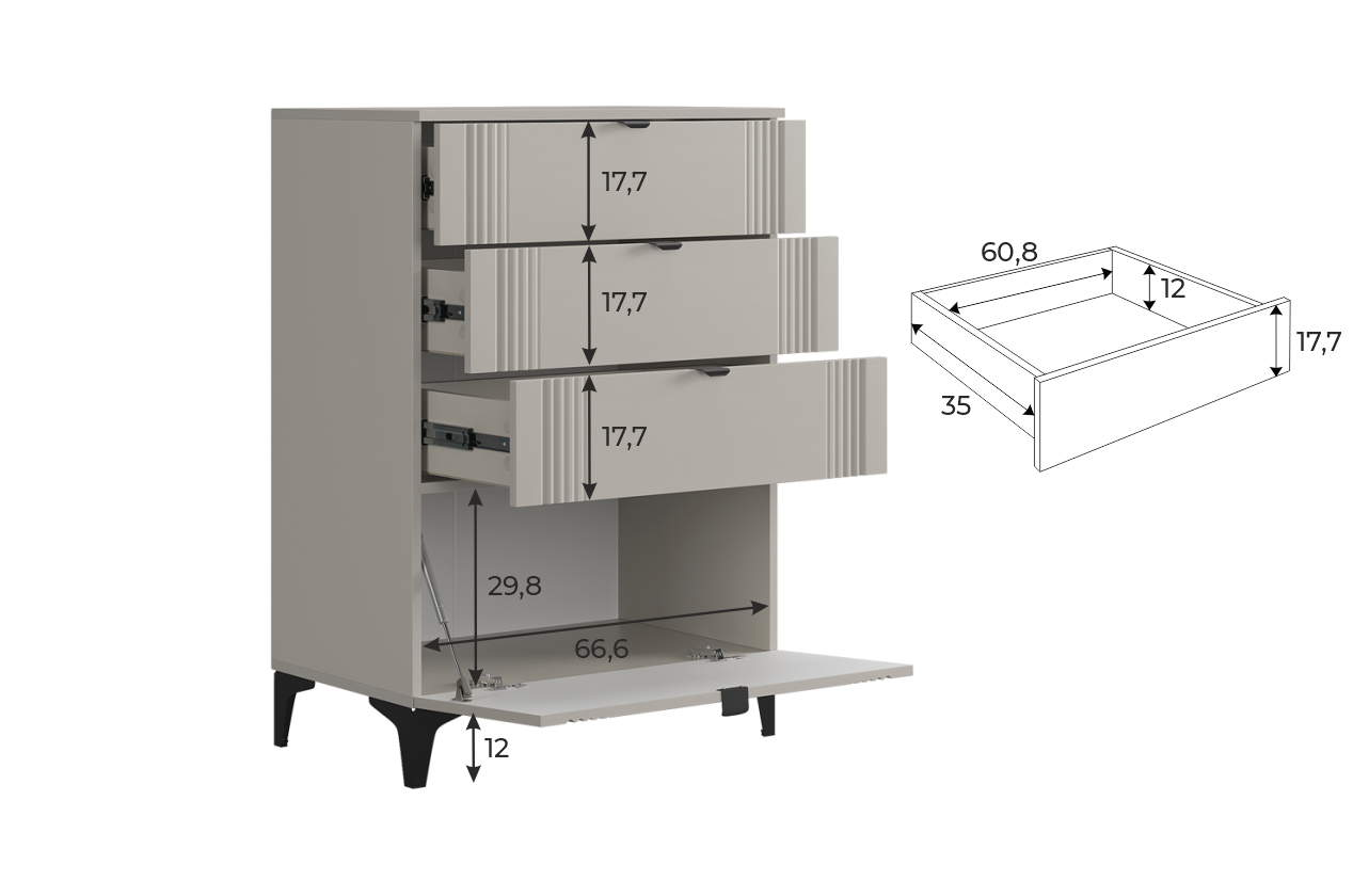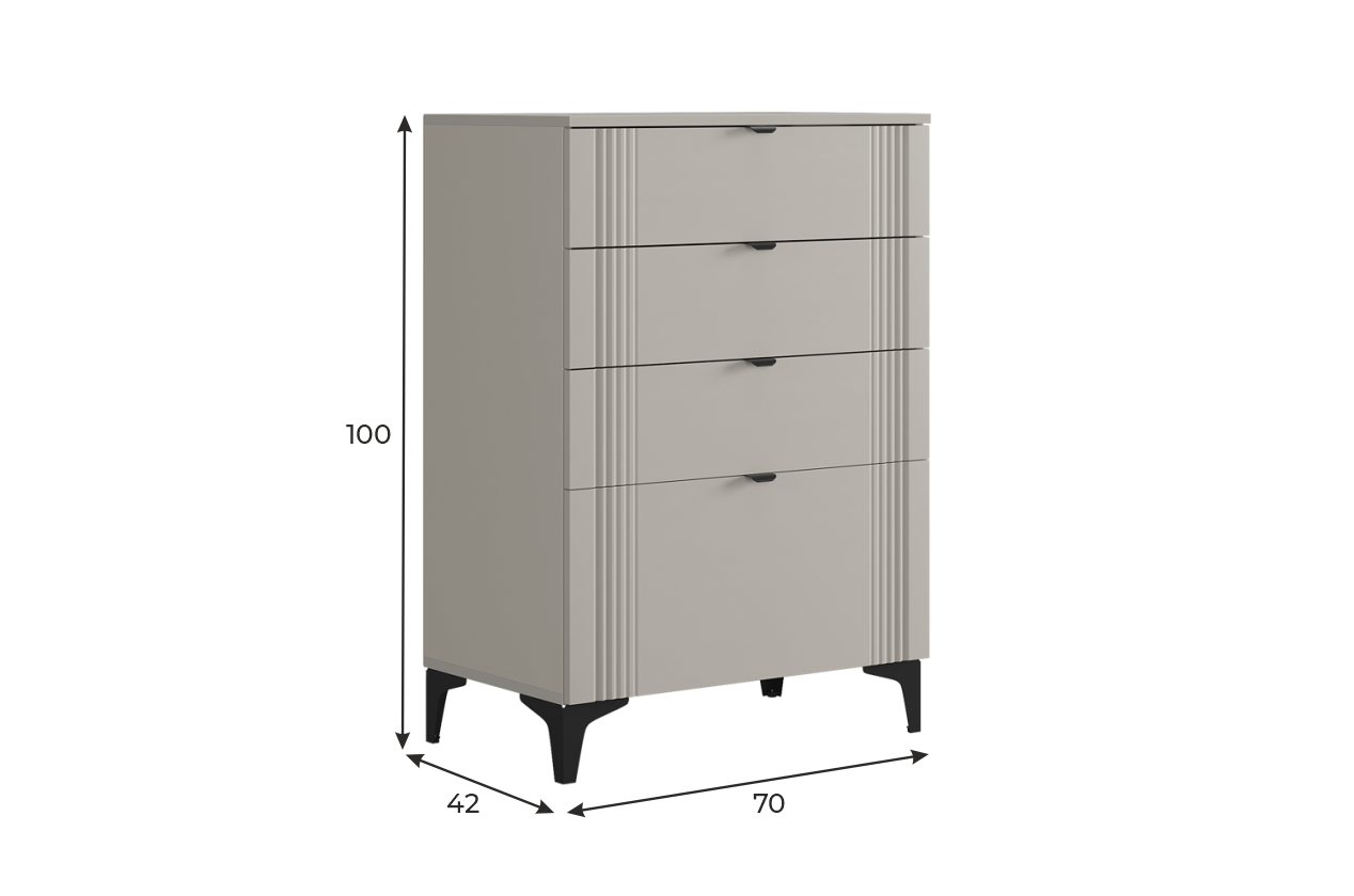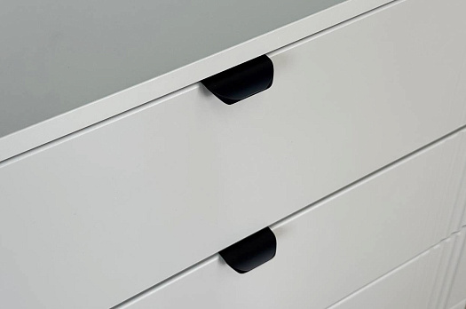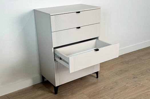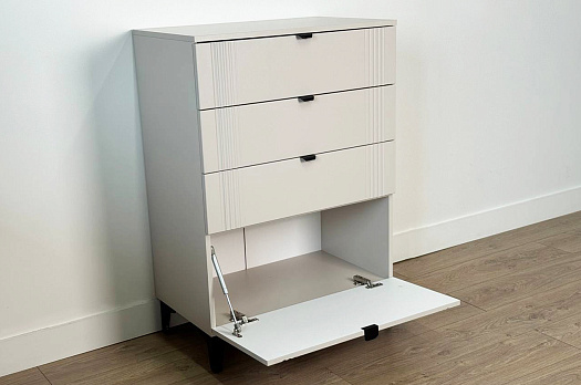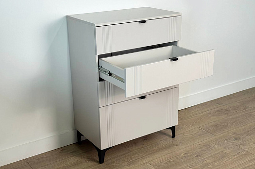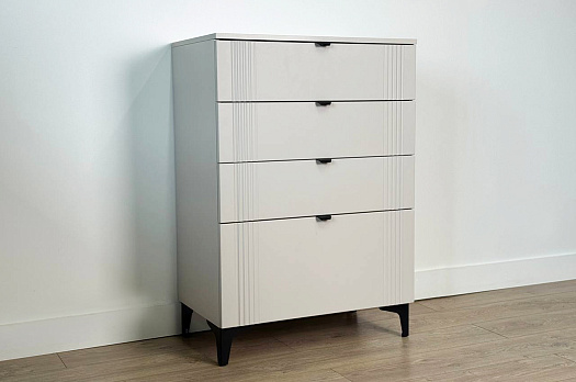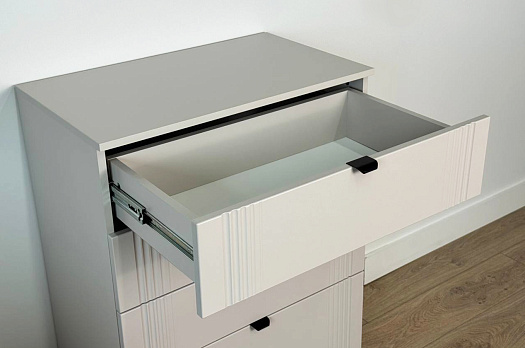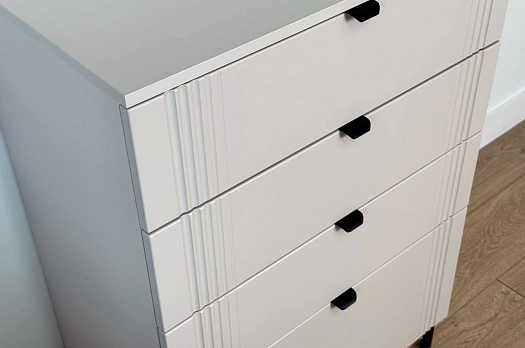 Комод изготовлен из качественных материалов: корпус выполнен из ЛДСП, что гарантирует прочность и долговечность, а фасад, выполненный из МДФ в плёнке ПВХ, не только выглядит эстетично, но и защищает комод от повреждений. Особое внимание заслуживает фрезеровка фасадов, которая придаёт изделию изысканный вид.