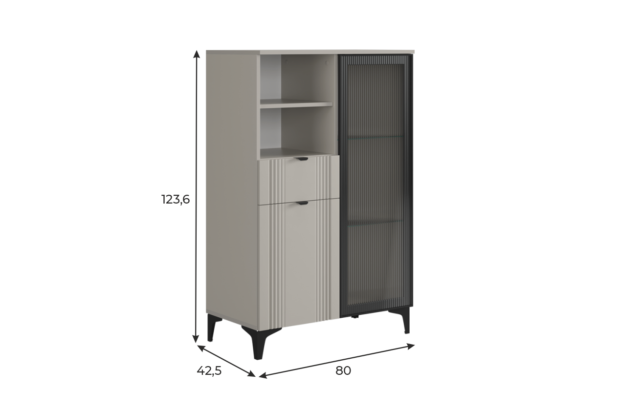 Дизайн комода продуман до мелочей: с одной стороны расположена стеклянная дверца, за которой находится просторное пространство для хранения. С другой стороны – ниша с открытой полкой, выкатной ящик и ещё одна глухая дверца, что позволяет гибко организовать хранение и поддерживать порядок в доме.