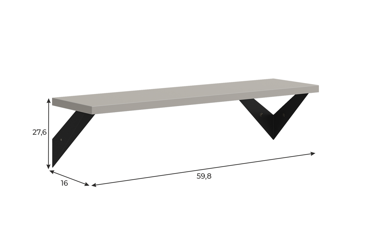 Полка крепится к стене с помощью чёрных треугольных держателей, которые обеспечивают устойчивость и долговечность. Особенность модели в том, что держатели можно расположить сверху, снизу или один сверху, другой снизу, что позволяет адаптировать полку под любые интерьерные решения и потребности.