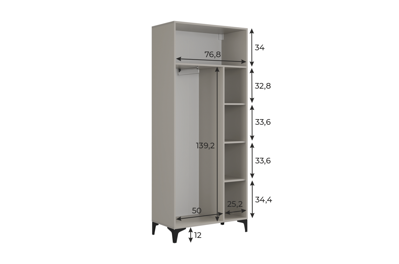 Шкаф оснащён надёжными металлическими ручками и имеет удобное внутреннее наполнение: справа расположены полки, а слева — штанга для вешалок. Это позволяет рационально использовать пространство и разместить различные типы одежды.
